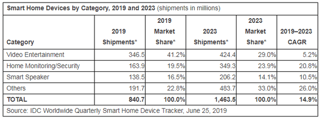 IDC預(yù)計,從2019年第一季度到今年年底,全球智能家居的市場規(guī)模將達(dá)到8.407億套,到2023年將增長到14.6億套,復(fù)合年增長率(CAGR)為14.9%。