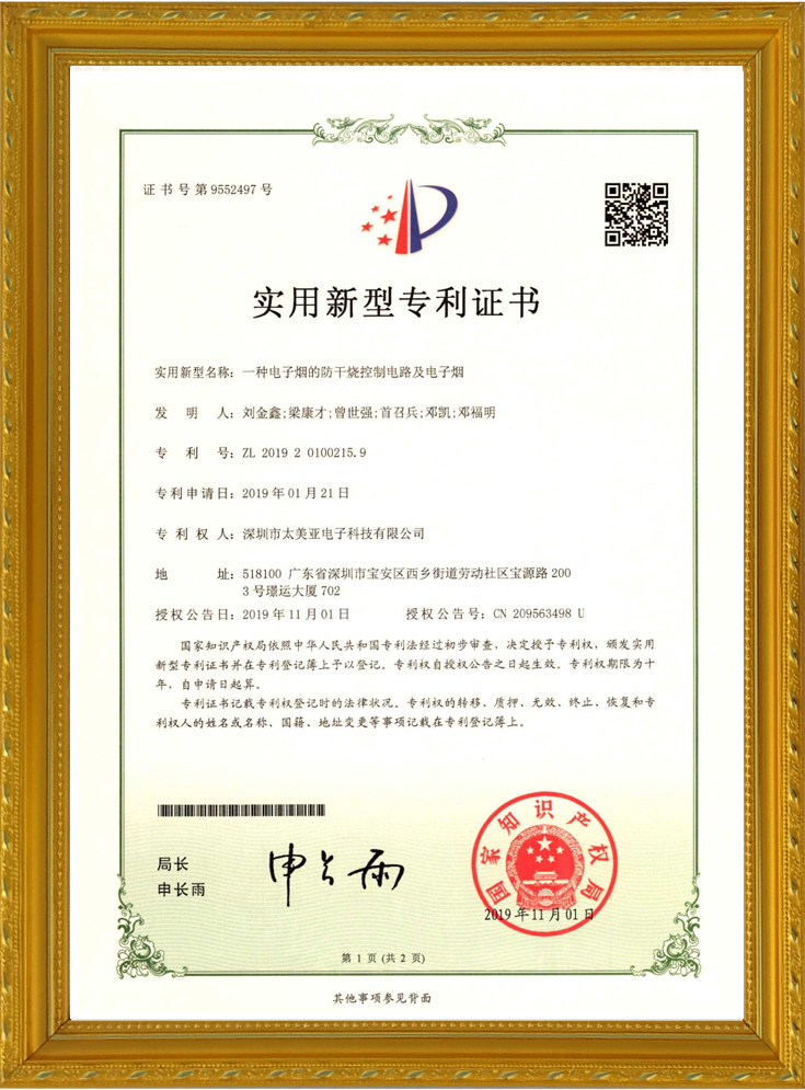 一種電子煙的防干燒控制電路及電子煙專利證書